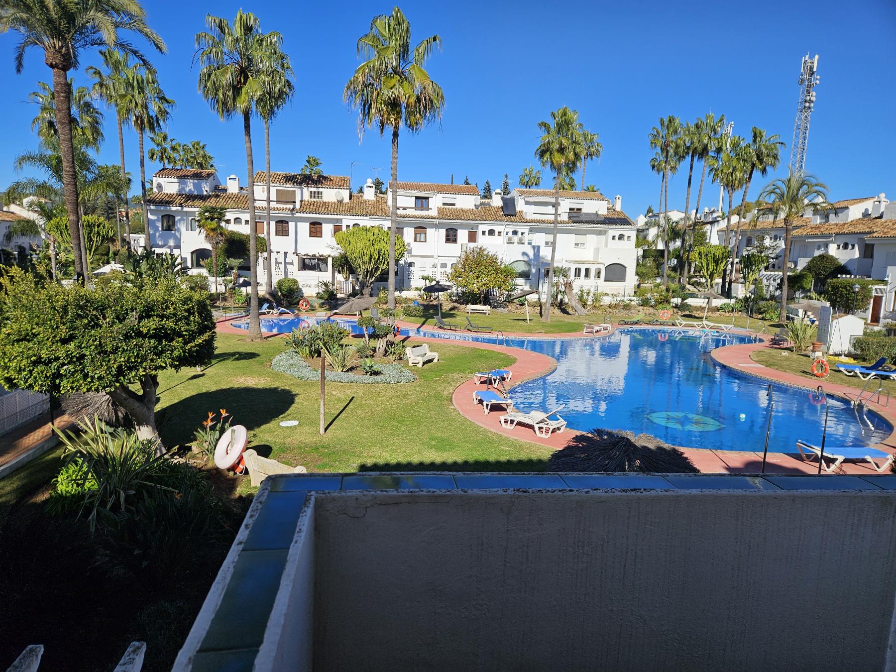 Fantástica adosada en excelente ubicación entre Estepona y San Pedro. Urbanización Las Yucas es un complejo cerrado de 60 casas adosadas ubicada en Atalaya Park a 300 metros de la playa. Construidos 150 m2. Dispone de 4 dormitorios, 3 baños y aseo, cocina completamente equipada, salón-comedor con chimenea, parking comunitario, suelos de mármol, piscina y jardines comunitarios, pista de tenis. Vistas a los jardines.